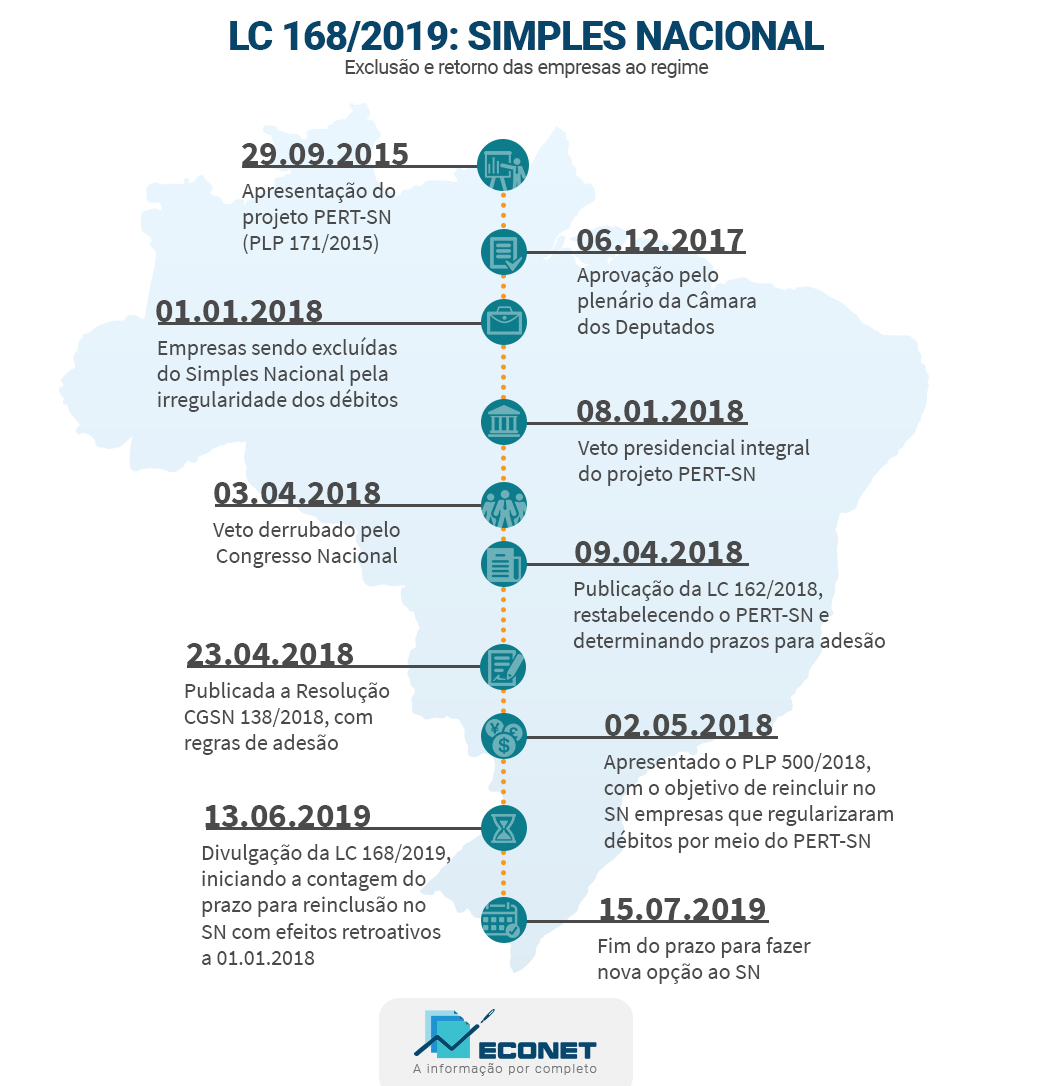 Foram publicadas a LC 162/2018 e a Resolução CGSN 138/2018, que trouxeram regras e prazos favoráveis de parcelamento e regularização do débitos. Ainda assim, a exclusão das empresas do Simples Nacional já havia ocorrido. Chegou, então, o PLP 500/2018, visando reinclusão das empresas prejudicadas. Só com a LC 168/2019 é que foi iniciada a contagem da reinclusão ao SN com data retroativa a 2018 – e ela será finalizada 15/07/2019.
