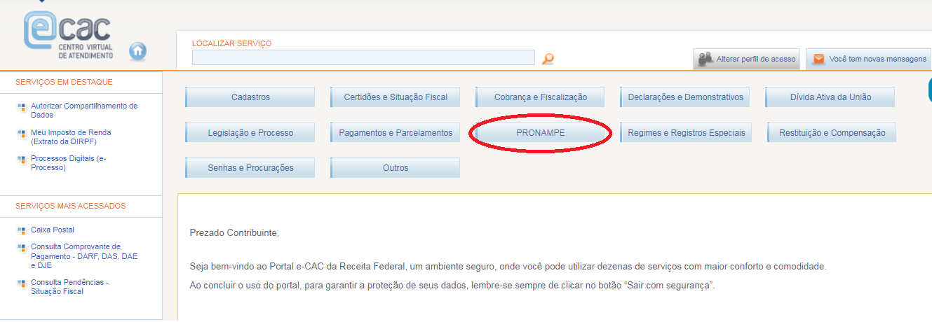 Ao entrar no Portal E-CAC pelo representante da empresa, selecionar a aba Pronampe: