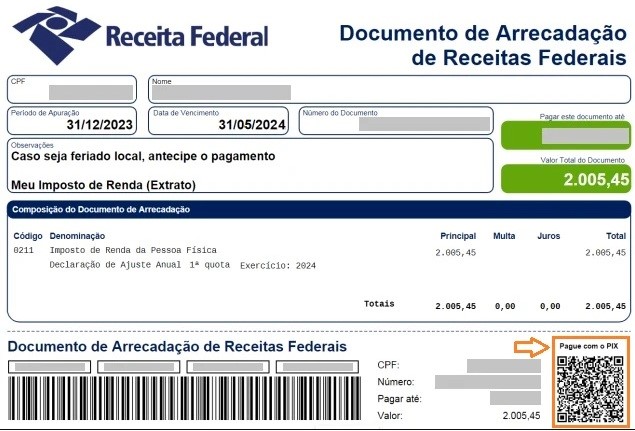 Para tanto, depois de enviar a declaração, no DARF que será gerado para pagamento do imposto constará um QR Code, que possibilitará o pagamento via PIX, conforme imagem abaixo.