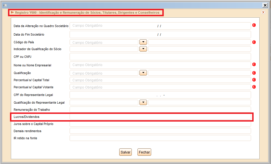 O registro Y600 é de caráter obrigatório para pessoa jurídica que possui até 999 dados de sócios, dirigentes, conselheiros e/ou titulares que tenham recebido maiores remunerações no período da ECF. Incluem-se nesse dados também aqueles que saíram durante o ano calendário e não fazem mais parte do quadro societário.