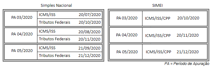 - Adiamento no pagamento de três período de apuração do DAS do Simples Nacional e Simei, envolvendo tanto o ICMS e ISS como os tributos da União: Resolução CGSN nº 154/2020;