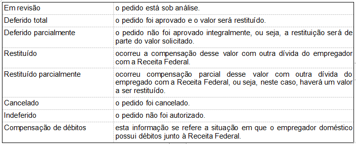 Segue abaixo o significado de cada andamento do pedido de restituição no portal: