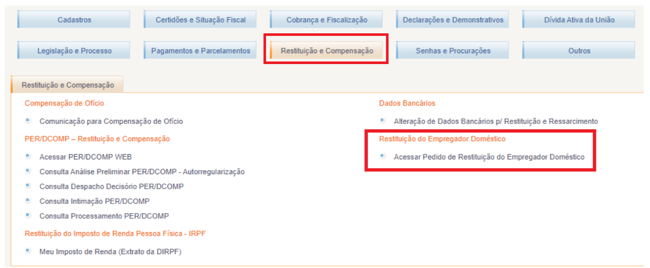 Quando o empregador doméstico acessar o e-CAC, basta selecionar o item “Restituição e Compensação” e, na sequência, clicar em “Acessar pedido de restituição do empregador doméstico”, conforme abaixo: