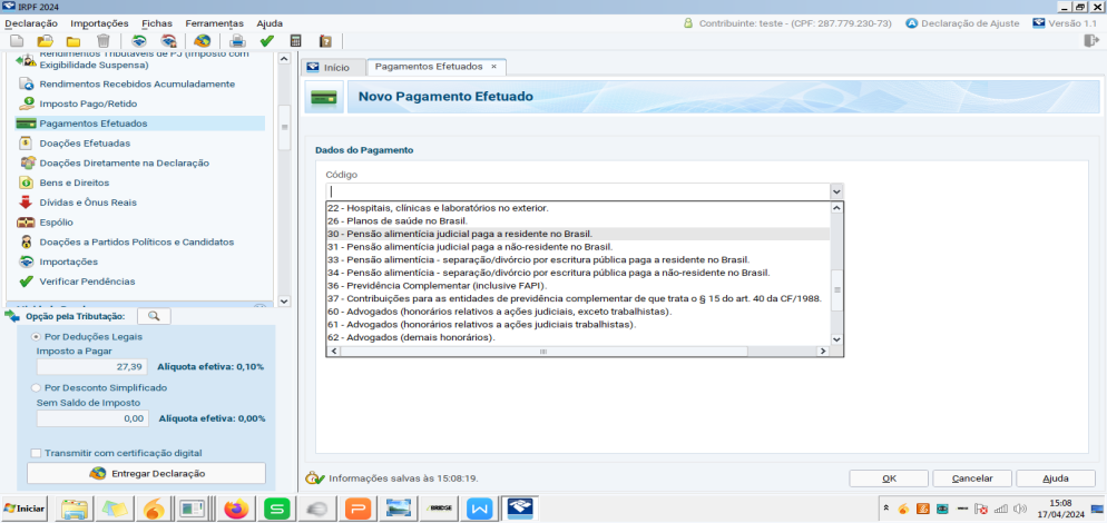 A pensão alimentícia paga pode ser deduzida na determinação da base de cálculo sujeita à tributação do imposto de renda. Para tanto, na ficha “Pagamentos Efetuados da Declaração de Ajuste Anual”, devem ser informados o nome e o número de inscrição no Cadastro de Pessoas Físicas (CPF) do beneficiário da pensão, assim como o valor total pago no ano: