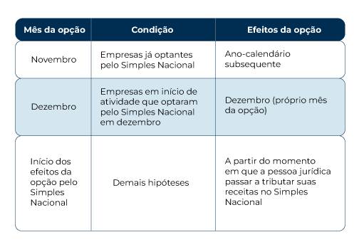 Portanto, para as empresas que atualmente já são optantes pelo Simples Nacional, em novembro de 2022, deverão fazer a opção de como irão tributar suas receitas no ano-calendário de 2023, devendo observar que essa opção é irretratável, ou seja, não pode ser alterada.
