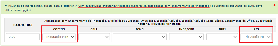 Após o preenchimento da receita de forma segregada, o contribuinte deverá selecionar no campo referente ao PIS e COFINS o item “Tributação Monofásica” ou “Substituição Tributária” conforme o caso.