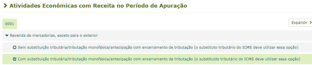 Na aplicação PGDAS-D, na informação “Atividades Econômicas com Receita no Período de Apuração”, seja na “Revenda de mercadorias, exceto para o exterior” ou na “Venda de mercadorias industrializadas pelo contribuinte, exceto para o exterior”, deve ser marcado a opção “Com substituição tributária / tributação monofásica / antecipação com encerramento de tributação (o substituído tributário do ICMS deve utilizar essa opção)” para fins de preenchimento dessa receita segregada: